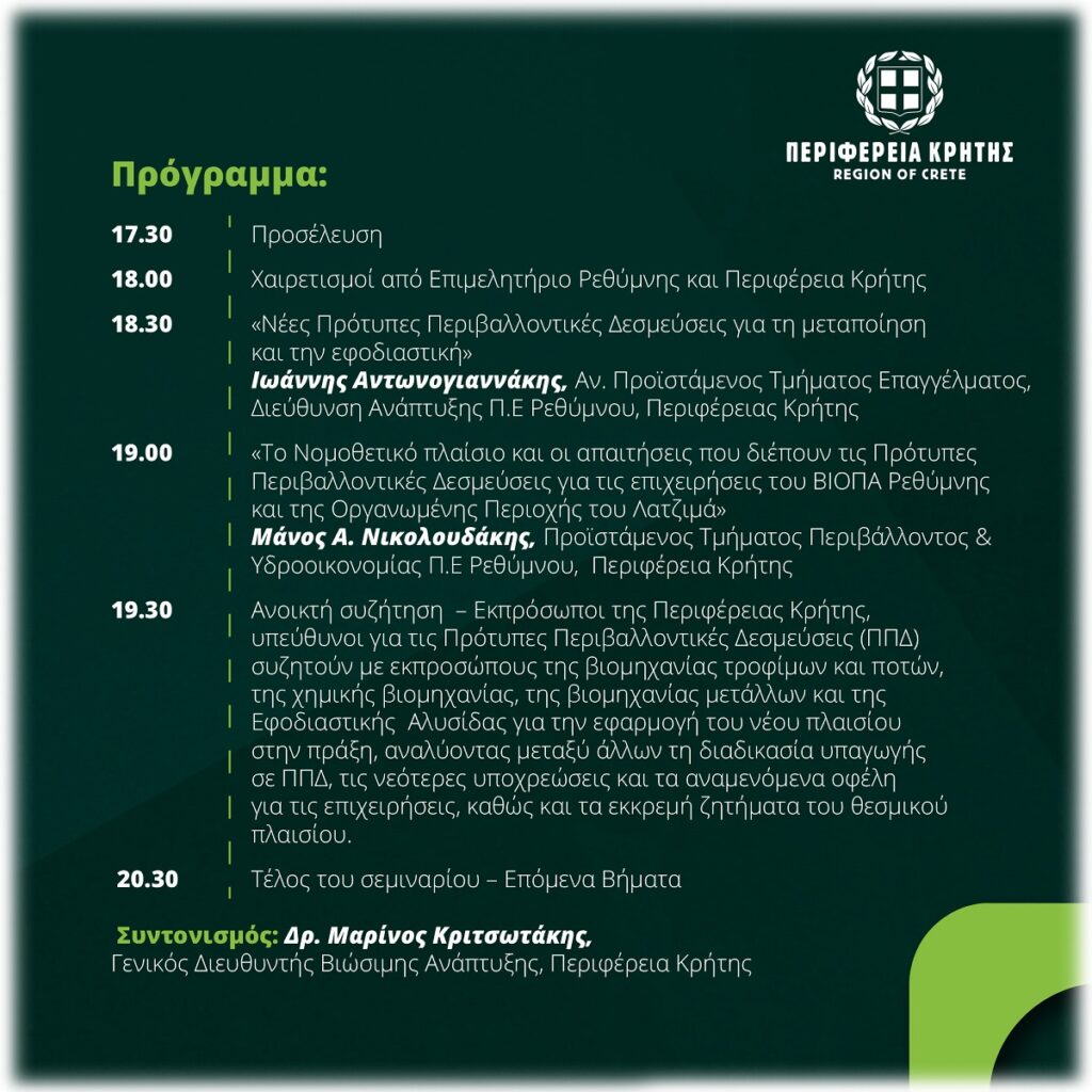Στην εκδήλωση, στελέχη της Περιφέρειας Κρήτης θα παρουσιάσουν το νέο πλαίσιο για τις Πρότυπες Περιβαλλοντικές Δεσμεύσεις (ΠΠΔ), τις υποχρεώσεις και τα αναμενόμενα οφέλη για τις επιχειρήσεις.