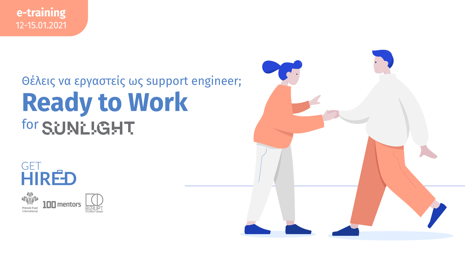 Για τη θέση “Support Engineer” στο Τμήμα Customer Enablement, πραγματοποιείται ένα εξειδευμέτο training από το Get Hired. Τo Ready to Work είναι ένα δωρεάν εκπαιδευτικό πρόγραμμα, διάρκειας 4 ημερών, που σκοπό έχει να παρέχει στους συμμετέχοντες τα απαραίτητα soft-skills για να ανταπεξέλθουν σε οποιαδήποτε θέση εργασίας σχετική με την εξυπηρέτηση πελατών στον τεχνολογικό τομέα. Θα επιλεχθούν για να συμμετέχουν σε αυτό μόνο 10 ενδιαφερόμενοι για τη συγκεκριμένη θέση εργασίας.