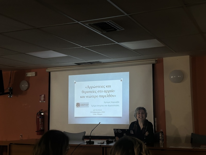Η Άρτεμις Καρναβά, Επίκουρη Καθηγήτρια Προϊστορικής Αρχαιολογίας του Πανεπιστημίου Κρήτης, μας εισήγαγε στο θέμα, αναδεικνύοντας  μέσα  από κειμενικές  μαρτυρίες και αρχαιολογικά  δεδομένα, ότι οι αρρώστιες και οι θεραπείες στο αρχαίο και νεώτερο παρελθόν, η αγωνία, το άγχος , ο πόνος, η ελπίδα, αποτελούν διαχρονικά ζητήματα. Μία ομιλία, ενδιαφέρουσα και σημαντική, που ενθαρρύνει τον διεπιστημονικό διάλογο  και γεφυρώνει ένα ιδεατό επιστημονικό χάσμα.