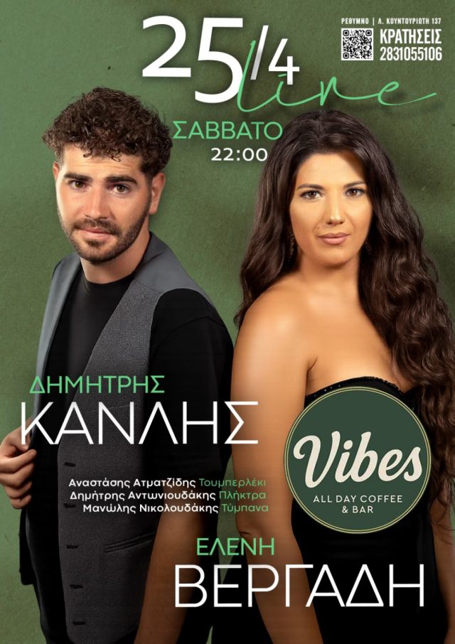 ΕΙΔΗΣΕΙΣ ΠΟΛΙΤΙΣΜΟΣ Ο Δημήτρης Κανλής & η Ελένη Βεργαδή στο Vibes All Day Coffee & Bar Απρ 19, 2026 FacebookTwitterWhatsAppLinkedinViberTelegramEmail Ο Δημήτρης Κανλής & η Ελένη Βεργαδή ζωντανά για μία λαϊκή βραδιά στο Vibes All Day Coffee & Bar. Σάββατο 25 Απριλίου 2026 – Έναρξη 22:00. Τηλ. κρατήσεων: 28310 55106 – 6972 341915