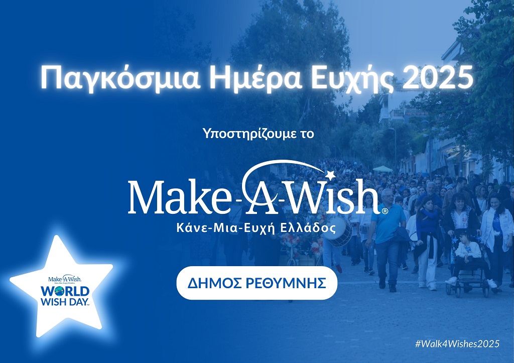 Με απόφαση του Δημοτικού Συμβουλίου Δήμου Ρεθύμνης, το βράδυ της 29ης Απριλίου 2025, το Δημαρχείο της πόλης «φωτίστηκε» στις μπλε αποχρώσεις του Make-A-Wish, συμβάλλοντας στη διάδοση του οράματος του οργανισμού, δηλαδή, να μπορέσει να φτάσει σε ΟΛΑ τα παιδιά που νοσούν από μία σοβαρή ασθένεια και έχουν ανάγκη από την εκπλήρωση της ευχής τους.