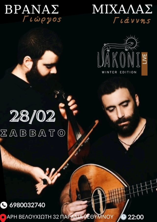 ΕΙΔΗΣΕΙΣ ΠΟΛΙΤΙΣΜΟΣ Ο Γιώργος Βρανάς και ο Γιάννης Μιχάλας ζωντανά στο Liakoni Φεβ 24, 2026 FacebookTwitterWhatsAppLinkedinViberTelegramEmail Ο Γιώργος Βρανάς και ο Γιάννης Μιχάλας ζωντανά στο Liakoni(Άρη Βελουχιώτη 32, Παραλία Ρεθύμνου) Σάββατο 28 Φεβρουαρίου – Έναρξη 22:00. Τηλ. για κρατήσεις 6980032740.
