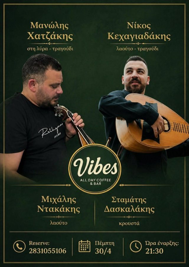 ΕΙΔΗΣΕΙΣ ΠΟΛΙΤΙΣΜΟΣ Ο Μανώλης Χατζάκης και ο Νίκος Κεχαγιαδάκης στο Vibes All Day Coffee & Bar Απρ 26, 2026 FacebookTwitterWhatsAppLinkedinViberTelegramEmail Ο Μανώλης Χατζάκης (λύρα) και ο Νίκος Κεχαγιαδάκης (λαούτο) ζωντανά στο Vibes All Day Coffee & Bar Πέμπτη 30 Απριλίου – Έναρξη 21:30. Τηλ. κρατήσεων: 28310 55106 – 6972 341 915