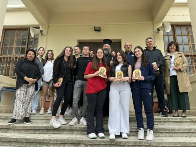 Με λόγια εγκάρδια μίλησε στη σχολική μας κοινότητα κι έδωσε την ευλογία του στους μαθητές, προσφέροντας σε όλους κι όλες από ένα αναμνηστικό δώρο.