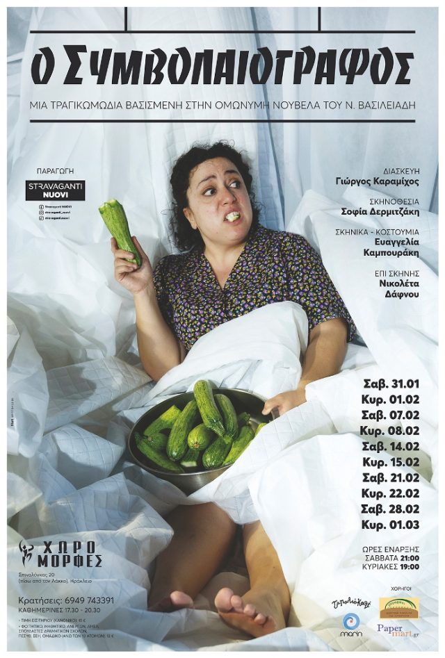 Την τραγικωμωδία αυτή, με τον τίτλο «Ο Συμβολαιογράφος», θα έχουν την ευκαιρία να παρακολουθήσουν οι κρητικοί στο Θέατρο «Xωρομορφές» (Σπιναλόγκας 20, πίσω από τον Λάκκο) στις 31/01, 01/02, 7/02, 8/02, 14/02, 15/02, 21/02, 22/02, 28/02 και 01/03.