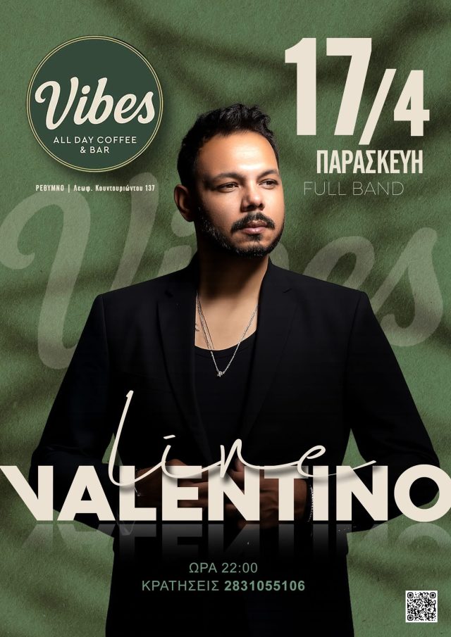 ΕΙΔΗΣΕΙΣ ΠΟΛΙΤΙΣΜΟΣ Ο Valentino ζωντανά στο Vibes All Day Coffee & Bar Απρ 12, 2026 FacebookTwitterWhatsAppLinkedinViberTelegramEmail O Valentino με την ορχήστρα του ζωντανά για μία λαϊκή βραδιά στο Vibes All Day Coffee & Bar. Παρασκευή 17 Απριλίου 2026 – Έναρξη 22:00. Τηλ. κρατήσεων: 28310 55106 – 6972 341915