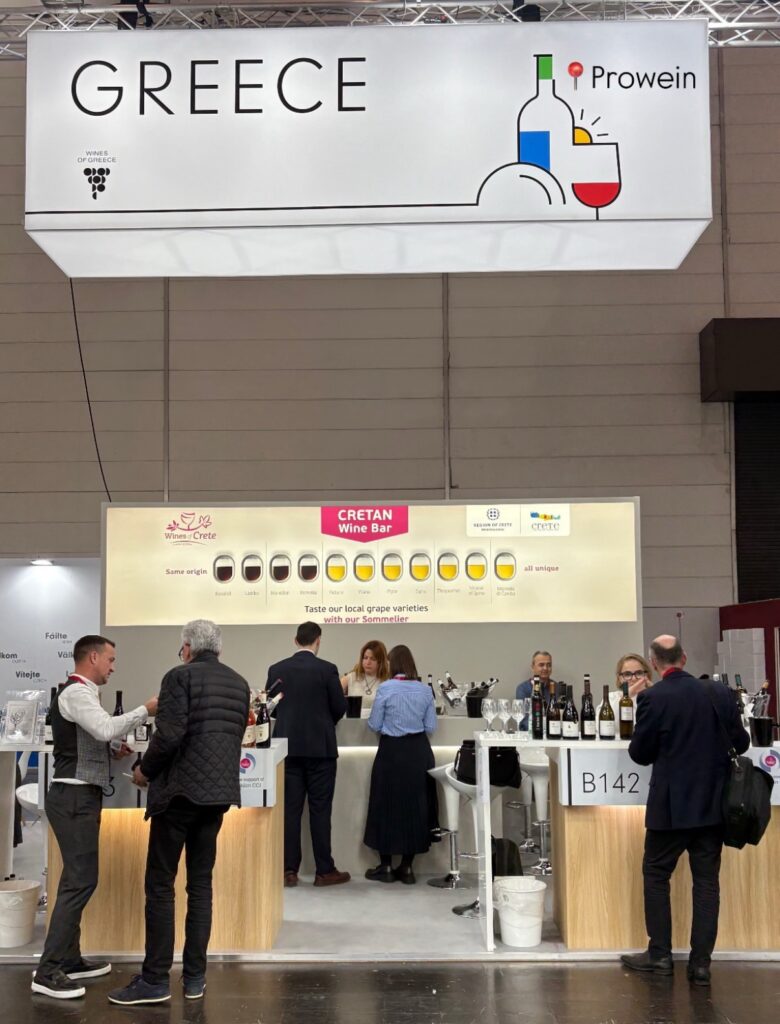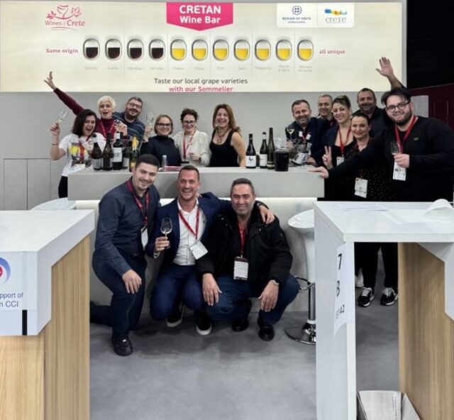 Στο περίπτερο της Κρήτης συμμετείχαν 8 κρητικά οινοποιεία: οινοποιείο Σίλβα – Δασκαλάκη, Οινοποιείο Διαμαντάκη, Οινοποιείο Δουλουφάκη, Οινοποιείο Ζαχαριουδάκη, Ιδαία Οινοποιητική, Οινοποιείο Λουλούδη, Οινοποιείο Ντουράκη και Οινοποιείο Στραταριδάκη. Πλήθος επαγγελματιών επισκέφθηκαν το ενιαίο wine bar που υποστήριζε η οινοχόος ΥρώΚολιακουδάκη Dip WSET, όπου οι επισκέπτες είχαν τη δυνατότητα να δοκιμάσουν ετικέτες από 36 οινοποιείατου νησιού και να πληροφορηθούν για τον Κρητικό αμπελώνα. Το ιδιαίτερο γραφικό που δημιουργήθηκε για να πλαισιώσει την παρουσία των οινοποιών, έδινε χρήσιμες πληροφορίες για τις τοπικές ποικιλίες, τις οινοπαραγωγικές ζώνες ΠΟΠ και ΠΓΕ, αλλά και για την μορφολογία του νησιού.