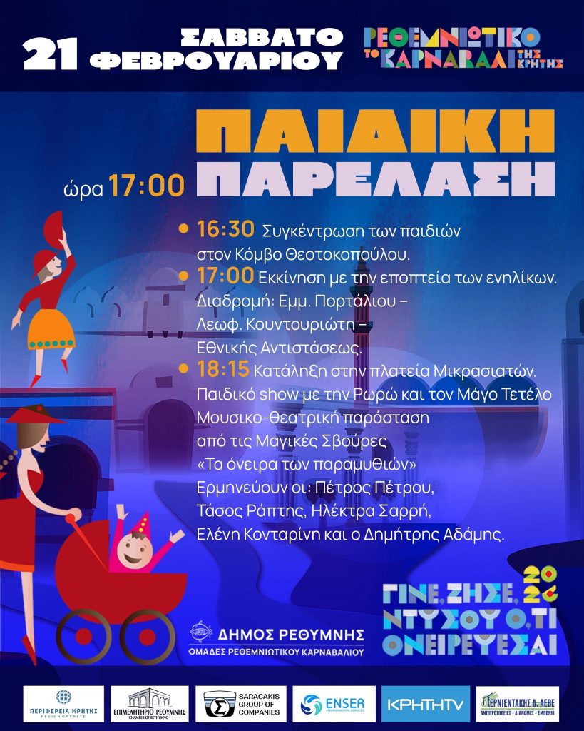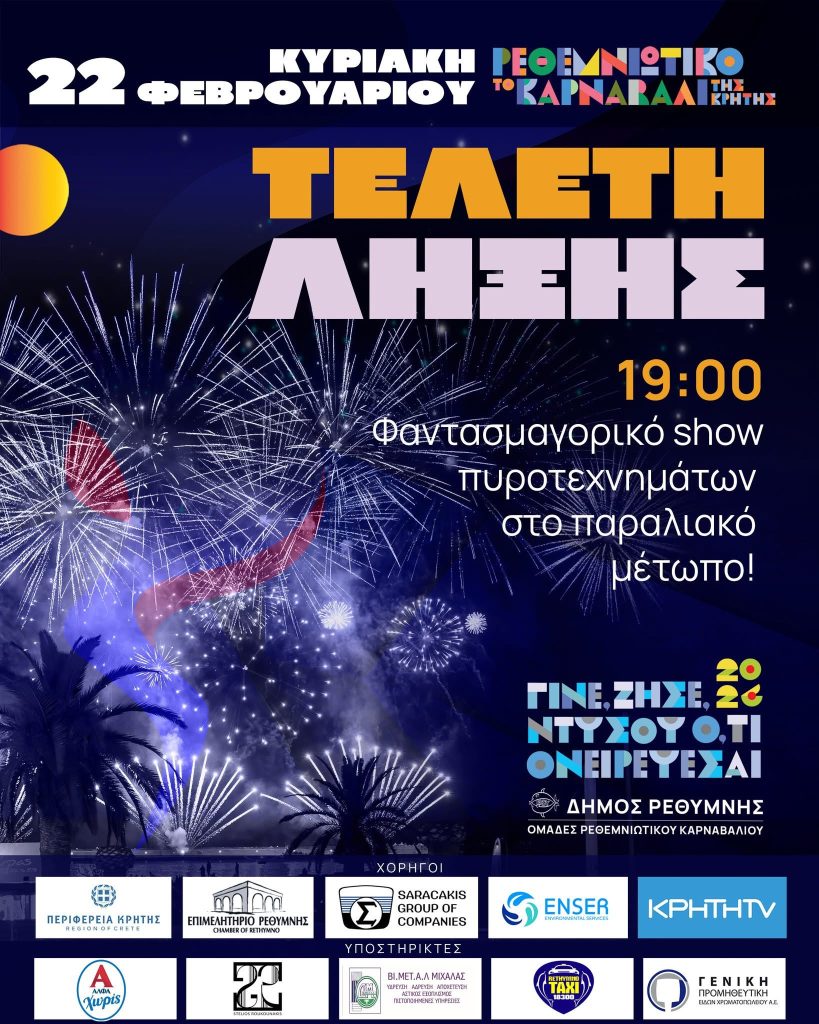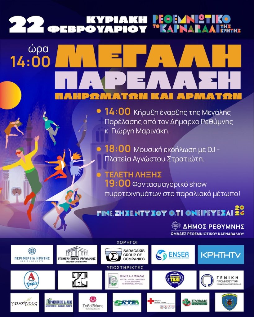 Tο Ρέθυμνο, μια πόλη ασφαλής, άψογα προετοιμασμένη, ζει την κορύφωση του Ρεθεμνιώτικου Καρναβαλιού ’26 και το πρόγραμμα των μεγάλων εκδηλώσεων έχει ως ακολούθως: