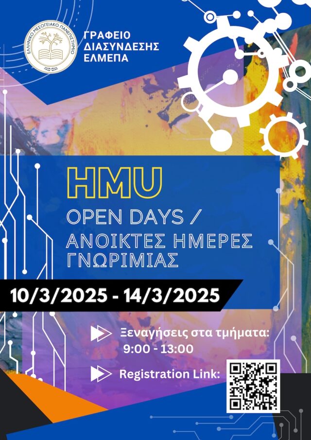 Το Γραφείο Διασύνδεσης & Σταδιοδρομίας του Ελληνικού Μεσογειακού Πανεπιστημίου (ΕΛΜΕΠΑ), διοργανώνει “δια ζώσης” Ανοικτές Ημέρες Γνωριμίας, Open Days 2025, από Δευτέρα 10 έως Παρασκευή 14 Μαρτίου 2025, στις Πανεπιστημιουπόλεις του Ηρακλείου, των Χανίων, του Ρεθύμνου και του Λασιθίου.