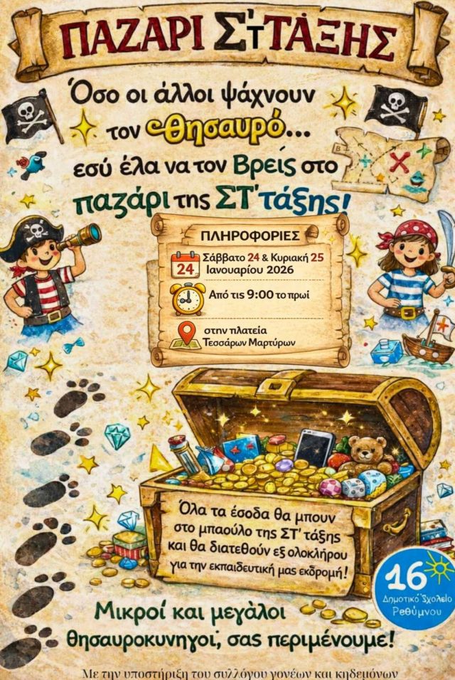 Ένα ξεχωριστό παζάρι με άρωμα… κυνηγιού θησαυρού διοργανώνουν οι μαθητές της ΣΤ’ τάξης του 16ου Δημοτικού Σχολείου Ρεθύμνου, το Σάββατο 24 και την Κυριακή 25 Ιανουαρίου 2026.