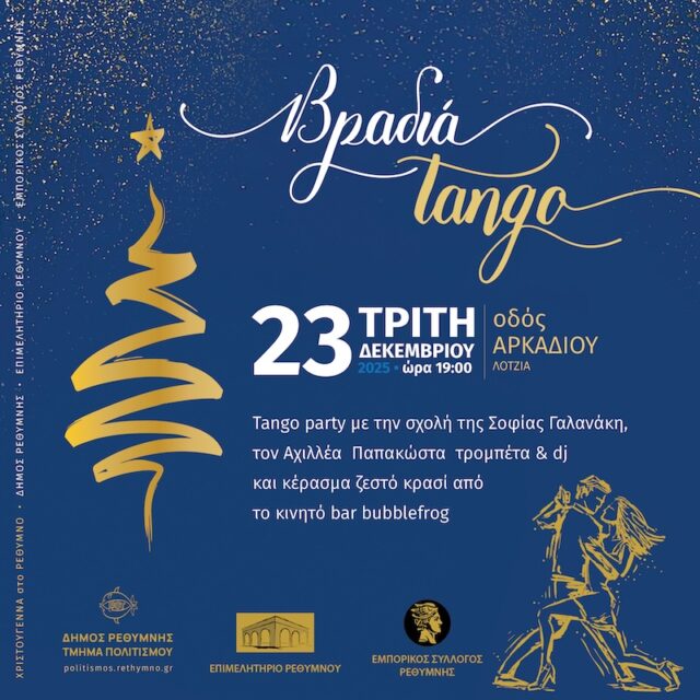 Την Τρίτη 23 Δεκεμβρίου και ώρα 19:00, σας περιμένουμε σε μια μοναδική Βραδιά Ταγκό στην οδό Αρκαδίου – Λότζια όπου ο ρυθμός και η μουσική θα μας ταξιδέψουν…