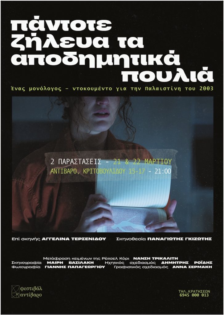 Το 11ο Φεστιβάλ Αντίβαρο παρουσιάζει τον μονόλογο για την Παλαιστίνη«Πάντοτε ζήλευα τα αποδημητικά πουλιά», σε σκηνοθεσία Παναγιώτη Γκιζώτη και με πρωταγωνίστρια την Αγγελίνα Τερσενίδου, ύστερα από μία πολύ πετυχημένη διαδρομή σε Αθήνα και Θεσσαλονίκη.