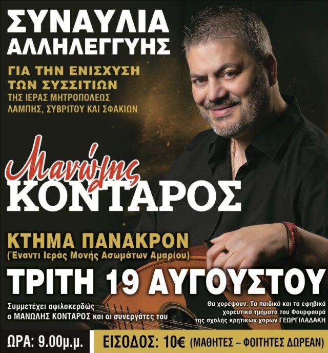Μια ξεχωριστή Συναυλία Αλληλεγγύης θα πραγματοποιηθεί την Τρίτη 19 Αυγούστου στις 9:00 μ.μ. στο Κτήμα Πανακρόν (έναντι Ιεράς Μονής Ασωμάτων Αμαρίου), με σκοπό την ενίσχυση των συσσιτίων της Ιεράς Μητροπόλεως Λάμπης, Συβρίτου και Σφακίων.
