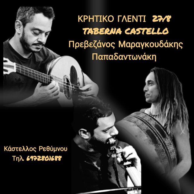 Ο Άρης Πρεβεζάνος, η Ζωή Παπαδαντωνάκη και ο Σταύρος Μαραγκουδάκης την Τετάρτη 27 Αυγούστου, με κρητικές μελωδίες στην Ταβέρνα Castello (Κάστελλος Ρεθύμνου).