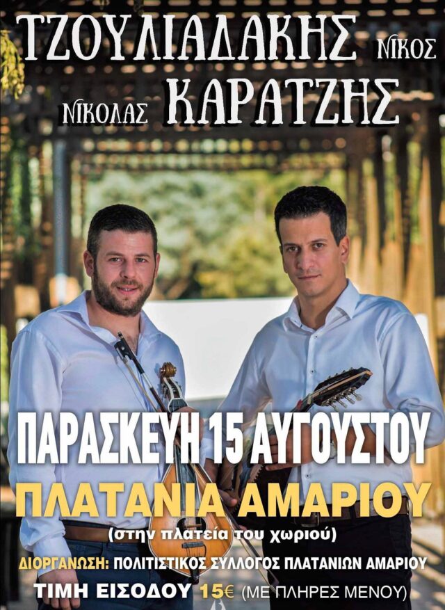 – Κυριακή 10/08/2025 ώρα 21:30 Πέραμα-Γη Μυλ/μου με τον Νίκο Καρκάνη – Δευτέρα 11/08/2025, ώρα 21:30, πλατεία Μικρασιατών, Ρέθυμνο με τον Μιχάλη Σταυρουλάκη
