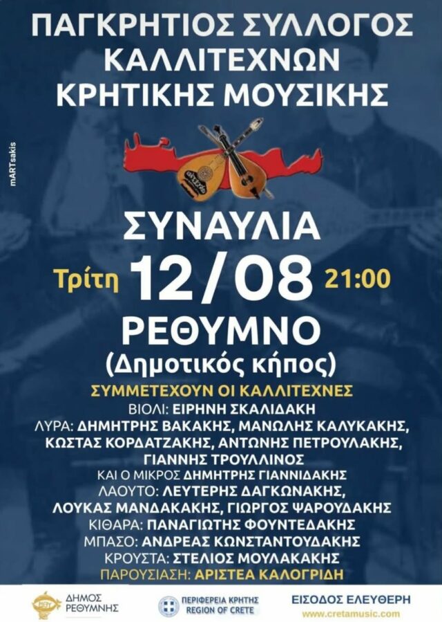 Ο Παγκρήτιος Σύλλογος Καλλιτεχνών Κρητικής μουσικής, πιστός στο ραντεβού του με τη μουσική παράδοση του τόπου μας, πραγματοποιεί μια συναυλία στο Ρέθυμνο, στο Δημοτικό Κήπο.