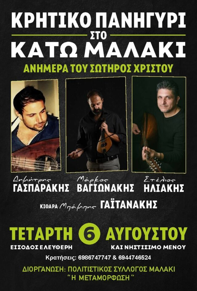 Ο Πολιτιστικός Σύλλογος Μαλάκι “Η Μεταμόρφωση” διοργανώνει μεγάλο κρητικό πανηγύρι την Τετάρτη 6 Αυγούστου στο Κάτω Μαλάκι, ανήμερα της εορτής του Σωτήρος Χριστού.
