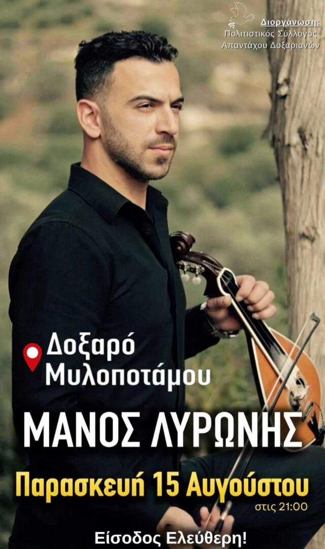 Ο Πολιτιστικός Σύλλογος Απανταχού Δοξαριανών διοργανώνει κρητικό γλέντι την Παρασκευή 15 Αυγούστου και ώρα 21:00 στην πλατεία του χωριού με το συγκρότημα του Μάνου Λυρώνη.
