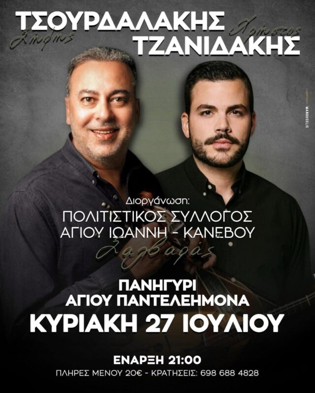 Ο Παραδοσιακός Μουσικός Σύλλογος Αποκορώνου “Ο Χαρίλαος” σε συνεργασία με την Περιφέρεια Κρήτης, τον Δήμο Ρεθύμνου και με την ευγενική υποστήριξη της Παγκρήτιας Ένωσης Αμερικής, την Κρητική Ομοσπονδία Αυστραλίας & Ν. Ζηλανδίας και το Παγκόσμιο Συμβούλιο Κρητών, σας προσκαλούν στην 3η “ΓΙΟΡΤΗ ΤΟΥ ΑΠΟΔΗΜΟΥ ΚΡΗΤΙΚΟΥ” την Δευτέρα 4 Αυγούστου και ώρα 20:30, στο Δημοτικό Κήπο Ρεθύμνου.