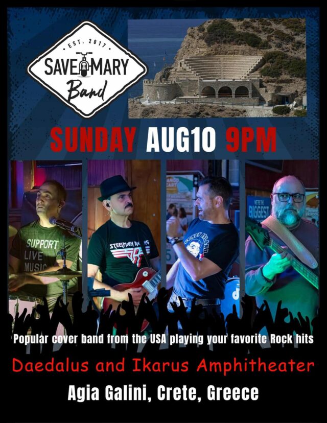 Την Κυριακή 10 Αυγούστου το θεατράκι μας θα γεμίσει με rock μουσικές που θα μας χαρίσει η Save Mary Band!