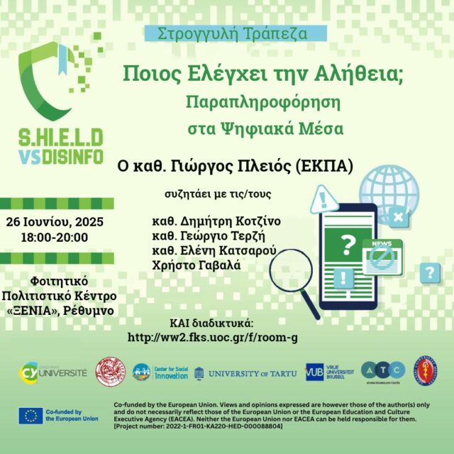 Στο πλαίσιο του Ευρωπαϊκού Έργου Erasmus+ KA220-HED με τίτλο SHIELD vs Disinformation, διοργανώνεται την Πέμπτη 26 Ιουνίου 2025, από τις 18:00 έως τις 20:00, στο Φοιτητικό Κέντρο Ξενία στο Ρέθυμνο, προσυνεδριακή εκδήλωση – στρογγυλό τραπέζι με θέμα: «Ποιος ελέγχει την αλήθεια; Παραπληροφόρηση στα ψηφιακά μέσα».