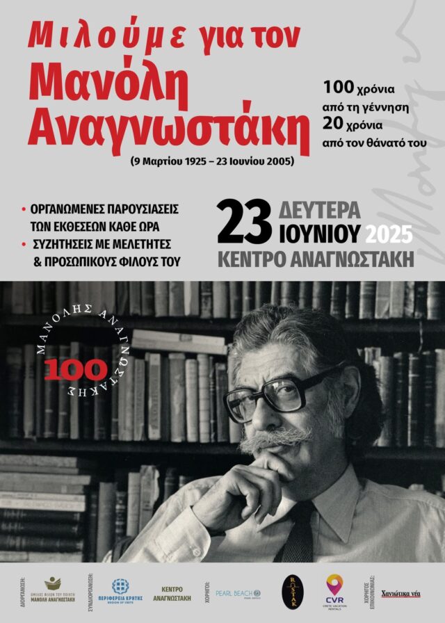 Διήμερο εκδηλώσεων θα πραγματοποιηθεί στα Ρούστικα Ρεθύμνου για τον ποιητή Μανόλη Αναγνωστάκη για τα 100 χρόνια από τη γέννηση και τα 20 χρόνια από τον θάνατό του (9 Μαρτίου 1925 – 23 Ιουνίου 2005)!