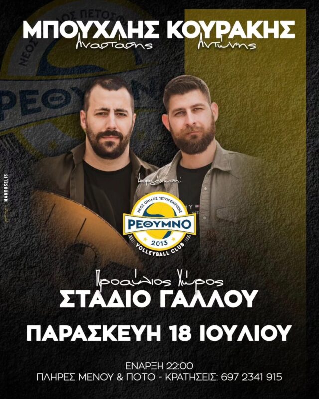 Ο Νέος Ο.ΠΕ. Ρεθύμνου σας προσκαλεί στη μεγάλη μουσικοχορευτική βραδιά που διοργανώνει την Παρασκευή 18 Ιουλίου, στον προαύλιο χώρο του γηπέδου Γάλλου!