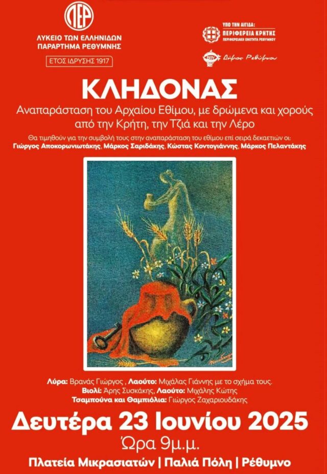 Την Δευτέρα 23 Ιουνίου 2025 και ώρα 21:00 στην Πλατεία Μικρασιατών, το Λύκειο των Ελληνίδων Ρεθύμνης διοργανώνει εκδήλωση αναπαράστασης του πανάρχαιου εθίμου του «Κλήδονα» με την φωτιά, τα ριζικάρικα και το «αμίλητο νερό», ενώ θα πλαισιώσει το έθιμο με τις χορευτικές του ομάδες που θα παρουσιάσουν χορούς από την Κρήτη και τα νησιά μας Τζιά και Λέρο με τις φορεσιές τους και ζωντανή μουσική.