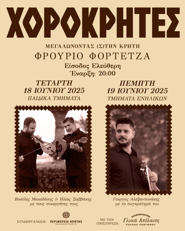 Διήμερη θεατρομουσικοχορευτική παράσταση με θέμα «Μεγαλώνοντας (σ)την Κρήτη» διοργανώνει την Τετάρτη 18 και την Πέμπτη 19 Ιουνίου στο φρούριο Φορτέτζα ο Λαογραφικός Όμιλος ΧΟΡΟΚΡΗΤΕΣ.