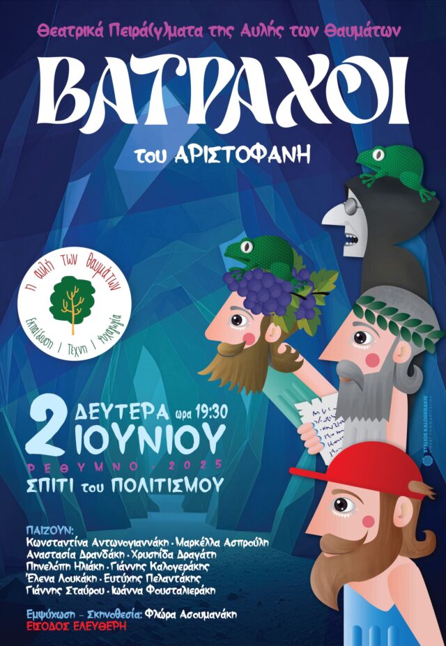 Μια μοναδική θεατρική εμπειρία υπόσχεται το Καλλιτεχνικό Εργαστήρι «Αυλή των Θαυμάτων» με την παράσταση «Βάτραχοι» του Αριστοφάνη, τη Δευτέρα 2 Ιουνίου 2025 και ώρα 19:30 στο Σπίτι του Πολιτισμού στο Ρέθυμνο.