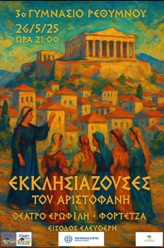 Η θεατρική ομάδα του 3ου Γυμνασίου Ρεθύμνου σας προσκαλεί στο έργο «ΕΚΚΛΗΣΙΑΖΟΥΣΕΣ» του Αριστοφάνη, σε διασκευή των Ευγενίας Μαραγκού και Κάρμεν Ρουγγέρη.