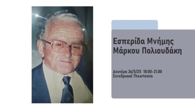 Εσπερίδα αφιερωμένη στη μνήμη του Μάρκου Πολιουδάκη θα πραγματοποιηθεί τη Δευτέρα 26 Μαΐου 2025 στο συνεδριακό κέντρο του ξενοδοχείου «ΤHEARTEMIS», στα πλαίσια των εκδηλώσεων εορτασμού της 84ης Επετείου της Μάχης της Κρήτης.