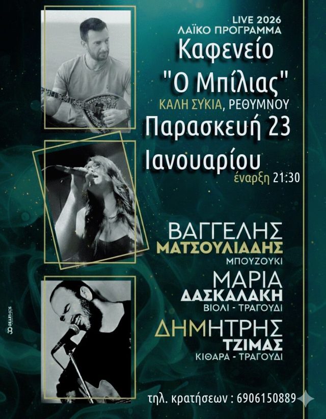 Τη βραδιά θα πλαισιώσουν μουσικά οι Βαγγέλης Κιμιώνης, Κλέαρχος Μανωλιούδης και Νίκος Λαγουδάκης.