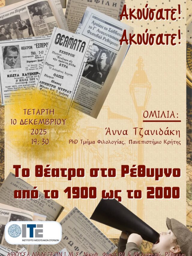 Διάλεξη της Άννας Τζανιδάκη με τίτλο: «Ακούσατε – Ακούσατε! Το θέατρο στο Ρέθυμνο από το 1900 ως το 2000» θα πραγματοποιηθεί την Τετάρτη 10 Δεκεμβρίου, στις 7:30 μ.μ., στο Ινστιτούτο Μεσογειακών Σπουδών του Ιδρύματος Τεχνολογίας και Έρευνας (Νικηφόρου Φωκά 130, Παλιά πόλη, Ρέθυμνο).