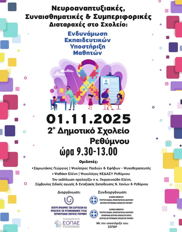 Το Κέντρο Πρόληψης των Εξαρτήσεων και Προαγωγής της Ψυχοκοινωνικής Υγείας Π.Ε. Ρεθύμνου, σε συνεργασία με τον ΕΟΠΑΕ, στο πλαίσιο των παρεμβάσεων του για την υποστήριξη της εκπαιδευτικής κοινότητας, συνδιοργανώνει με τις Διευθύνσεις της Α/θμιας και Β/θμιας Εκπαίδευσης και την υποστήριξη του ΣΕΠΕΡ, ημερίδα με θέμα «Νευροαναπτυξιακές, συμπεριφορικές και συναισθηματικές διαταραχές: Ενδυνάμωση εκπαιδευτικών – Υποστήριξη μαθητών».