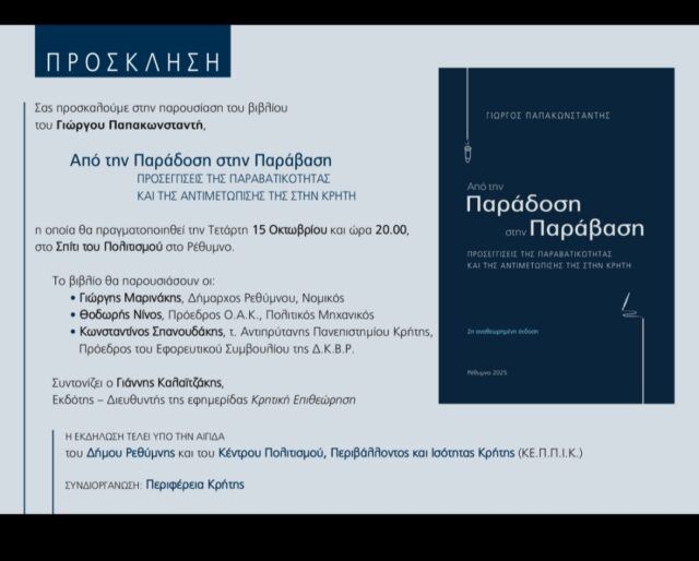 Τη συζήτηση θα συντονίσει ο Γιάννης Καλαϊτζάκης, εκδότης και διευθυντής της Κρητικής Επιθεώρησης.