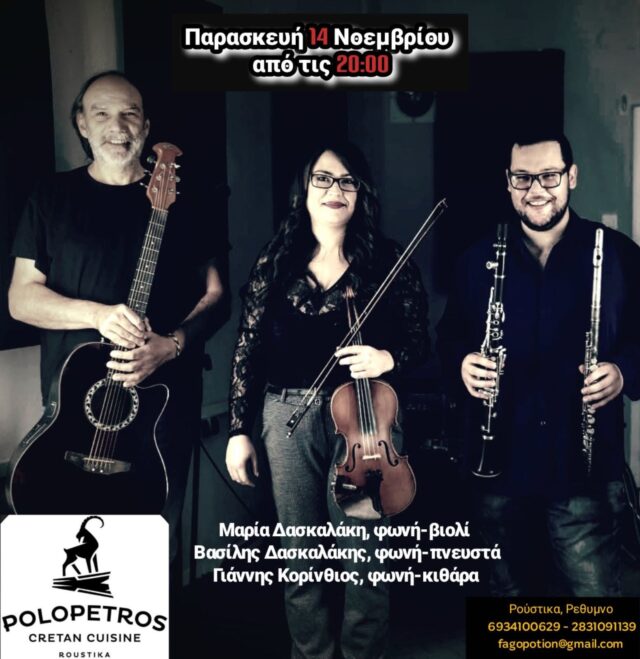 Μουσική βραδιά στην Ταβέρνα Πολόπετρος στα Ρούστικα Ρεθύμνου με τη Μαρία Δασκαλάκη (φωνή, βιολί), τον Γιάννη Κορίνθιο (φωνή, κιθάρα) και το Βασίλη Δασκαλάκη (πνευστά, φωνή).