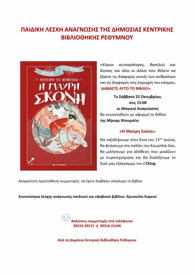 Το Σάββατο 25 Οκτωβρίου, στις 15:00, οι Mαγικοί Αναγνώστες θα συναντηθούν με αφορμή το βιβλίο της Μίριαμ Ντουμπίνι «Η Μαύρη Σκόνη».