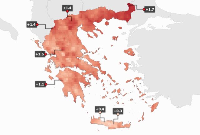 Η μέση μέγιστη θερμοκρασία στην Ελλάδα το 2023 ήταν σε όλες τις περιοχές υψηλότερη από τη μέση τιμή της κλιματικής περιόδου 1991-2020.