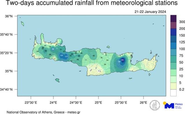 Το συνολικό ύψος βροχής ξεπέρασε τα 120 χιλιοστά σε περιοχές των Χανίων και τα 180 χιλιοστά σε περιοχές του Λασιθίου.