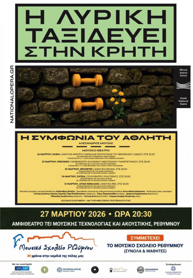 Σας προσκαλούμε την Παρασκευή 27 Μαρτίου και ώρα 20:30 στο αμφιθέατρο του ΤΕΙ Μουσικής Τεχνολογίας και Ακουστικής, να ζήσετε από κοντά τη «Συμφωνία του Αθλητή», σε συνεργασία με το Μουσικό Σχολείο Ρεθύμνου, μια πρωτοποριακή παράσταση μουσικού θεάτρου του Αλέξανδρου Μούζα, που ταξιδεύει στις πόλεις της Κρήτης από την Εθνική Λυρική Σκηνή.