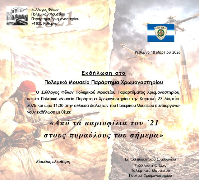 Ο Σύλλογος Φίλων Πολεμικού Μουσείου Παραρτήματος Χρωμοναστηρίου και το Πολεμικό Μουσείο Παράρτημα Χρωμοναστηρίου την Κυριακή 22 Μαρτίου 2026 και ώρα 11:30 στην αίθουσα διαλέξεων του Πολεμικού Μουσείου συνδιοργανώνουν εκδήλωση με θέμα: «Από τα καριοφίλια του 1821 στους πυραύλους του σήμερα»