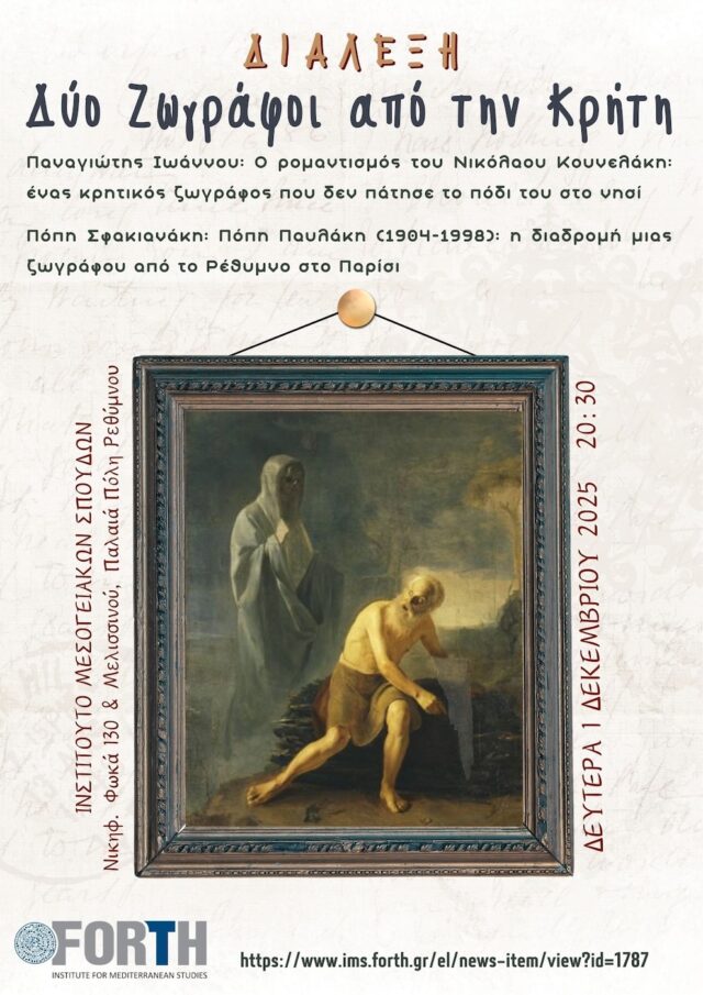 Με επίκεντρο την πολιτιστική του παρακαταθήκη του νησιού μας και εστίαση σε «Δύο ζωγράφους από την Κρήτη», συνεχίζεται, τη Δευτέρα 1 Δεκεμβρίου 2025, στις 20.30, ο κύκλος των ανοιχτών επιστημονικών ομιλιών που συνδιοργανώνουν ο Δήμος Ρεθύμνου και το Ινστιτούτο Μεσογειακών Σπουδών του Ιδρύματος Τεχνολογίας και Έρευνας (ΙΤΕ).
