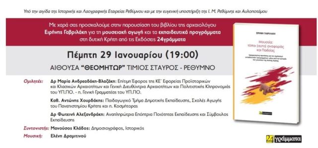 Η Ιστορική και Λαογραφική Εταιρεία Ρεθύμνου, με τη ευγενική υποστήριξη της Ιεράς Μητρόπολης Ρεθύμνης και Αυλοποτάμου, προσκαλεί το κοινό στην παρουσίαση του βιβλίου της αρχαιολόγου Ειρήνης Γαβριλάκη, με τίτλο «Μουσεία: τόποι (αυτo) αναφοράς και Παιδείας», που κυκλοφορεί από τις Εκδόσεις 24γράμματα.