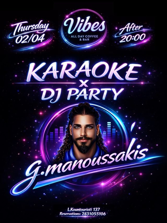 Την Πέμπτη 2 Απριλίου, μετά τις 20:00, το Vibes φιλοξενεί ένα εκρηκτικό Karaoke x DJ Party, όπου η διασκέδαση ανεβαίνει στα ύψη.