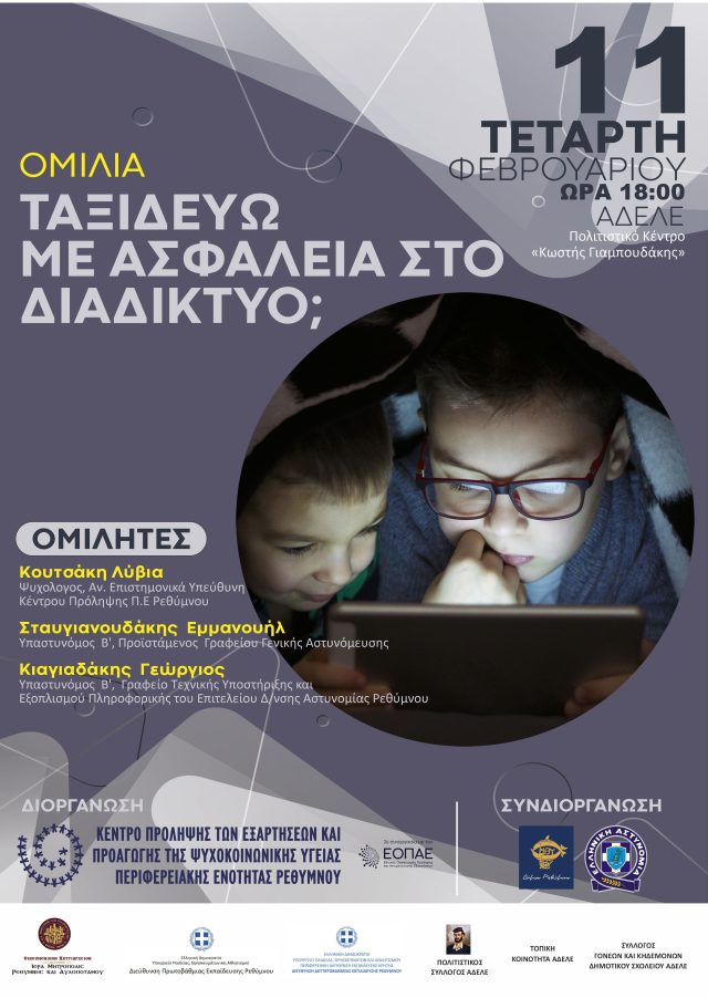 Το Κέντρο Πρόληψης των Εξαρτήσεων και Προαγωγής της Ψυχοκοινωνικής Υγείας Π.Ε Ρεθύμνης, με πρωτοβουλία του προέδρου κ. Σαρρή Μιχάλη, συνεχίζει την υλοπολιηση της καμπάνιας ενημέρωσης-ευαισθητοποίησης της κοινότητας με θέμα: «Ταξιδεύω με Ασφάλεια στο Διαδίκτυο;» που θα απευθύνεται σε πολίτες όλης της Περιφερειακής Ενότητας Ρεθύμνου.