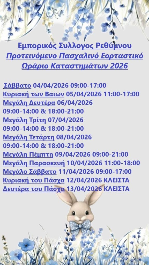 Ο Δήμος Ρεθύμνης μέσω του Αντιδήμαρχου Παιδείας, Δια Βίου Μάθησης και Νέας Γενιάς Νεκτάριου Παπαδογιάννη, του Αντιδημάρχου Πολιτικής Προστασίας Γιώργο Σκορδίλη και της Αντιδημάρχου Κοινωνικών Υπηρεσιών Άννας Ελευθεριάδου-Γκίκα, ανακοινώνει οτι αυριο, Πέμπτη, 2 Απριλίου 2026, δεν θα λειτουργήσει κανένα σχολείο εντός των διοικητικών ορίων του.