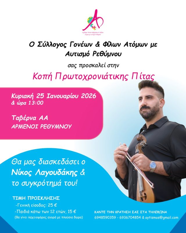 Ο Σύλλογος Γονέων & Φίλων Ατόμων με Αυτισμό Ρεθύμνου σας προσκαλεί στην κοπή της πρωτοχρονιάτικης πίτας του, για να ξεκινήσουμε τη χρονιά μαζί, στηρίζοντας το έργο του συλλόγου μας.