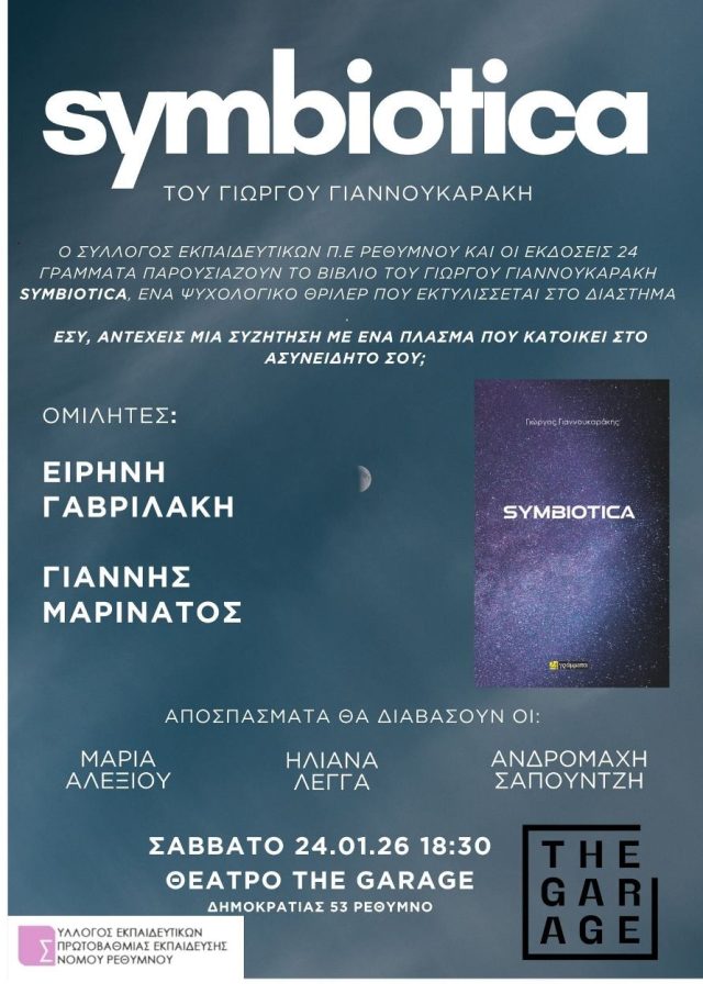 Ο Σύλλογος Εκπαιδευτικών Π.Ε. Ρεθύμνου και οι εκδόσεις 24 Γράμματα παρουσιάζουν το νέο βιβλίο του Γιώργου Γιαννουκαράκη, με τίτλο Symbiotica, στο The Garage Theatre στο Ρέθυμνο, το Σάββατο 24-1-2026 στις 18:30.