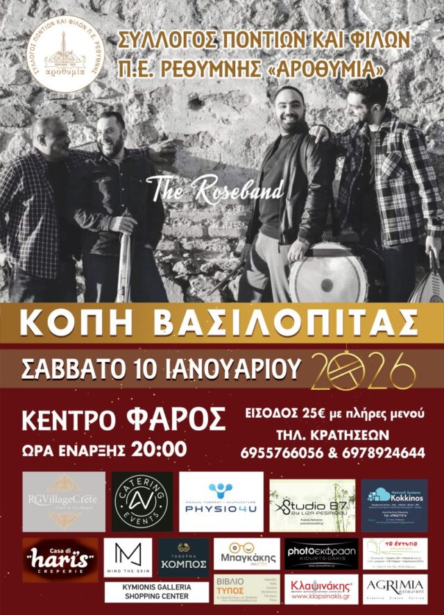 Ο Σύλλογος Ποντίων και Φίλων Π.Ε. Ρεθύμνης «Αροθυμία» διοργανώνει την ετήσια κοπή της βασιλόπιτας το Σάββατο 10 Ιανουαρίου 2026, στο Κέντρο «Φάρος» στο Ρέθυμνο.